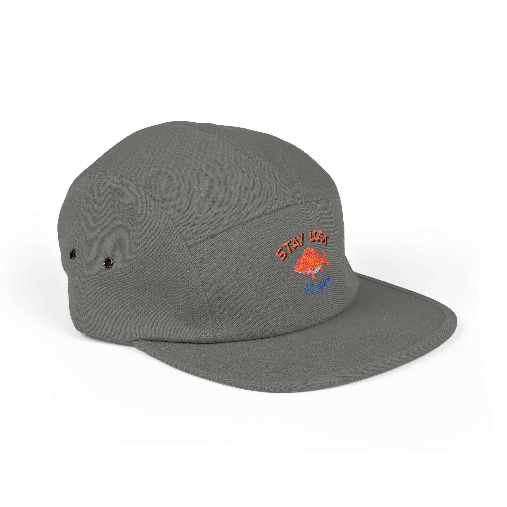 A laid-back five-panel cap embroidered with a tiny, sunlit fish and the phrase “STAY LOST.” Lightweight but sturdy, it settles low on the forehead and wears in like an old friend — the kind of cap you reach for when you’re heading out to wander beaches, bike alleys, or neighborhood creeks. The muted khaki canvas and subtle stitched artwork give it a lived-in, adventurous feel without shouting for attention. The adjustable nylon strap lets you dial in a secure fit, while metal eyelets keep airflow steady on warmer days. Slip it on, toss your keys in a pocket, and go find a quiet spot to watch the tide change.