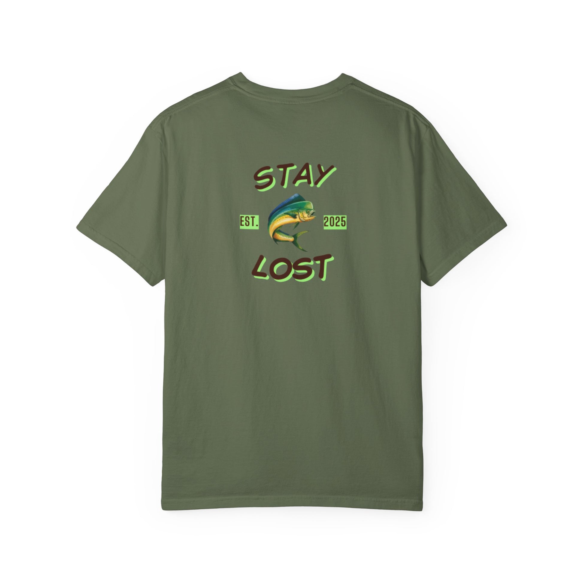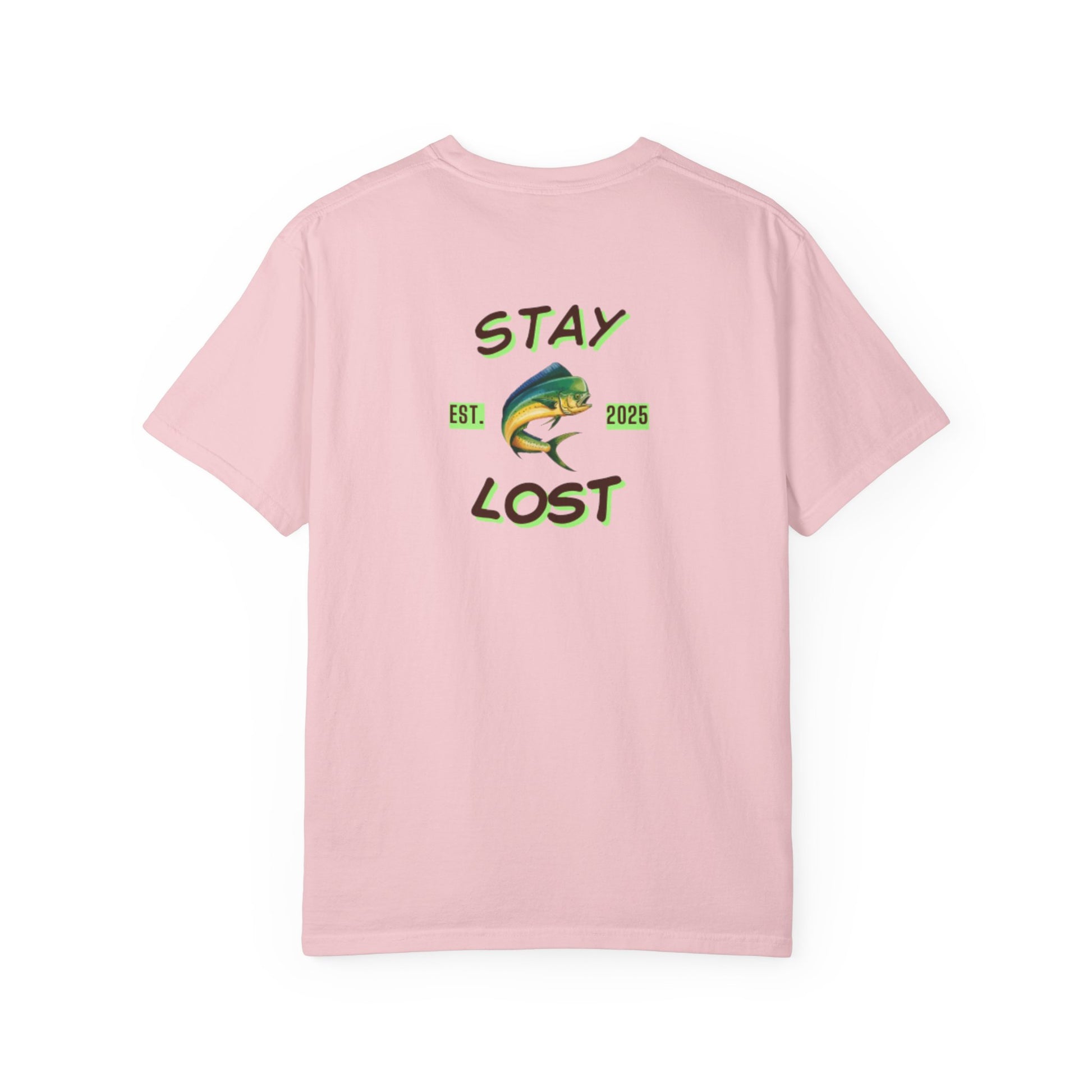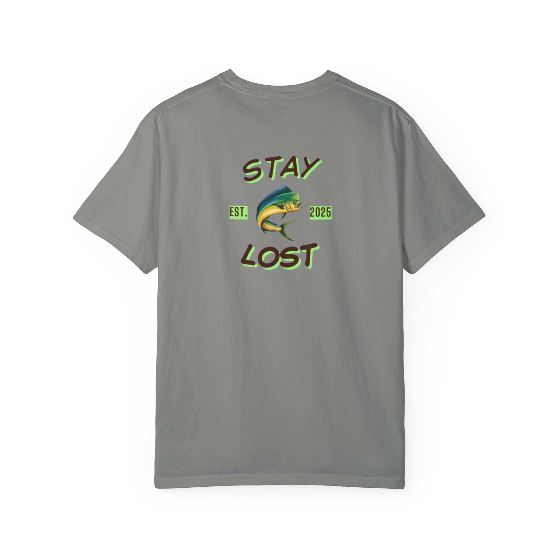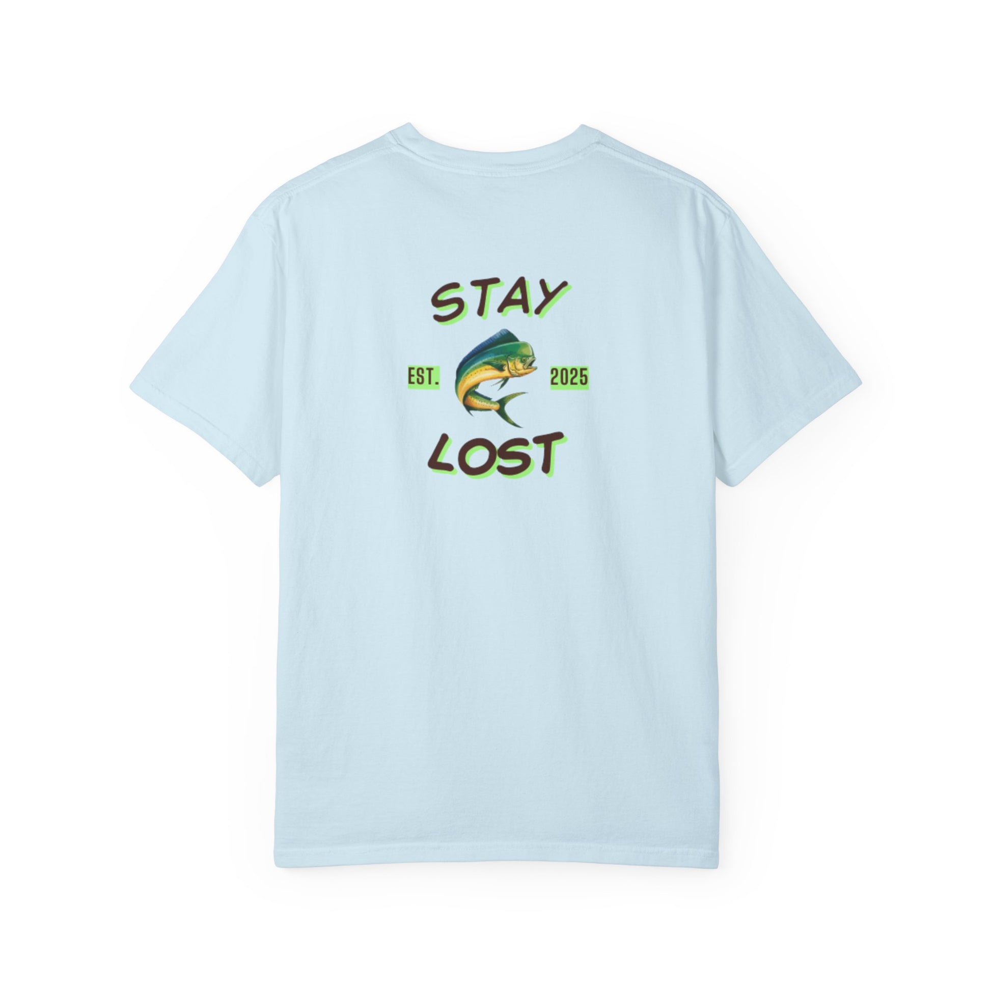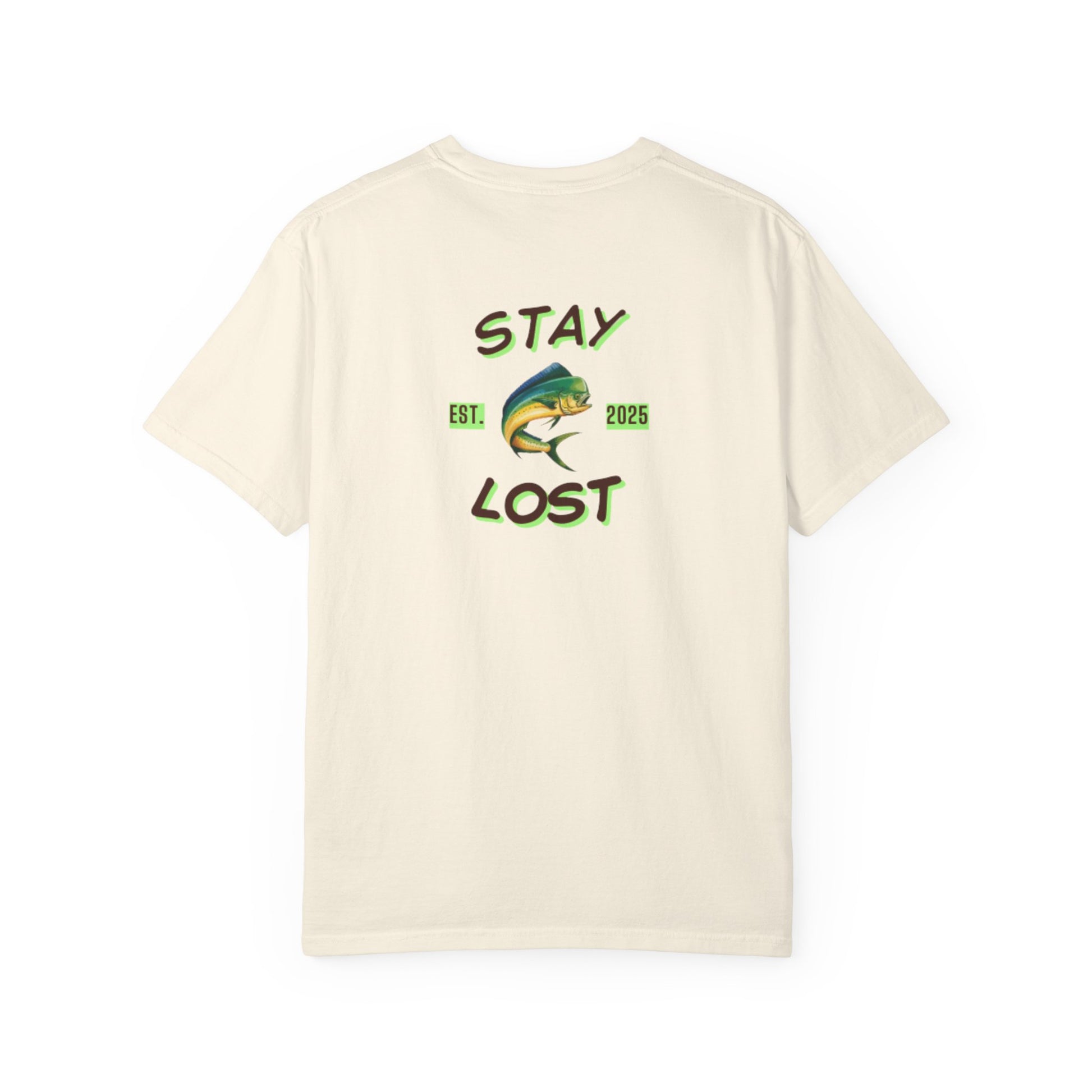 A relaxed, garment-dyed cotton tee that channels slow mornings on the water. Soft, broken-in color and a roomy fit make it feel like an old favorite from the first wear. A small, compass-like emblem sits over the heart while the back features a bold, hand-drawn mahi and the phrase “STAY LOST” — a little nod to getting lost in the moment: sun on the waves, lines out, and no rush to be anywhere else. Wear it for dawn trips, backyard hangs, or when you need a reminder to unplug and follow the tide.